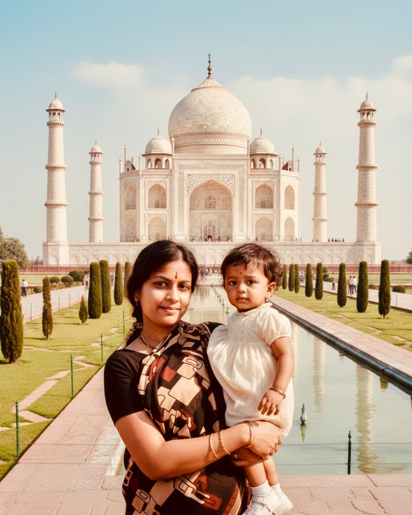 There’s a real photograph of my mother holding me as a baby in our small Pune home. Same sari, same baby, same pose. The AI version moves us in front of the Taj Mahal. A place we never went when I was small. We lived in Delhi for years, but there was never enough time, enough money, enough something to make those little weekend pilgrimages to monuments.