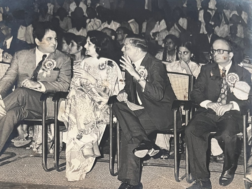 The annual pre-Independence Day office party. The night before I was born. Dilip Kumar and Saira Banu in the front row, with Appa. My name almost decided.