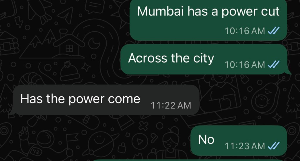 The last text exchange I had with my mother was about a power cut. I was in Mumbai. I told her: Mumbai has a power cut. Across the city. An hour later, she asked: has the power come. I said: no.